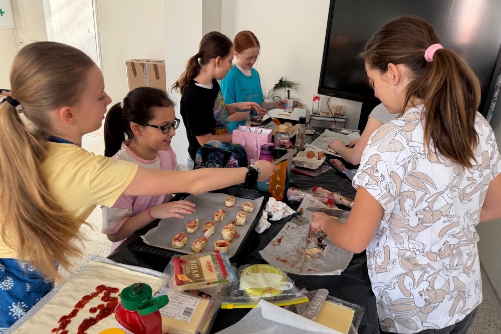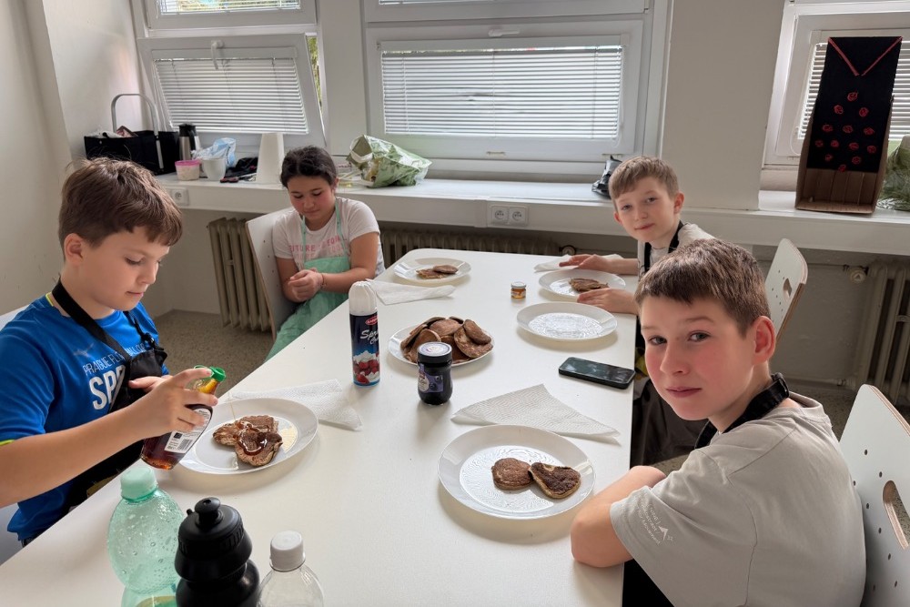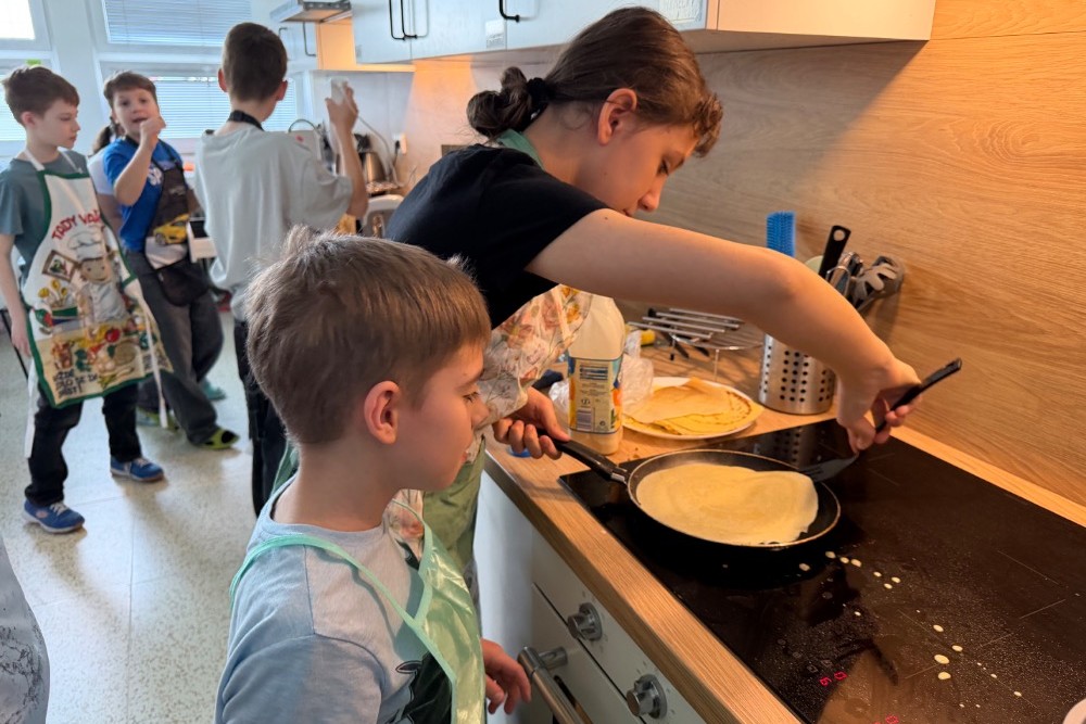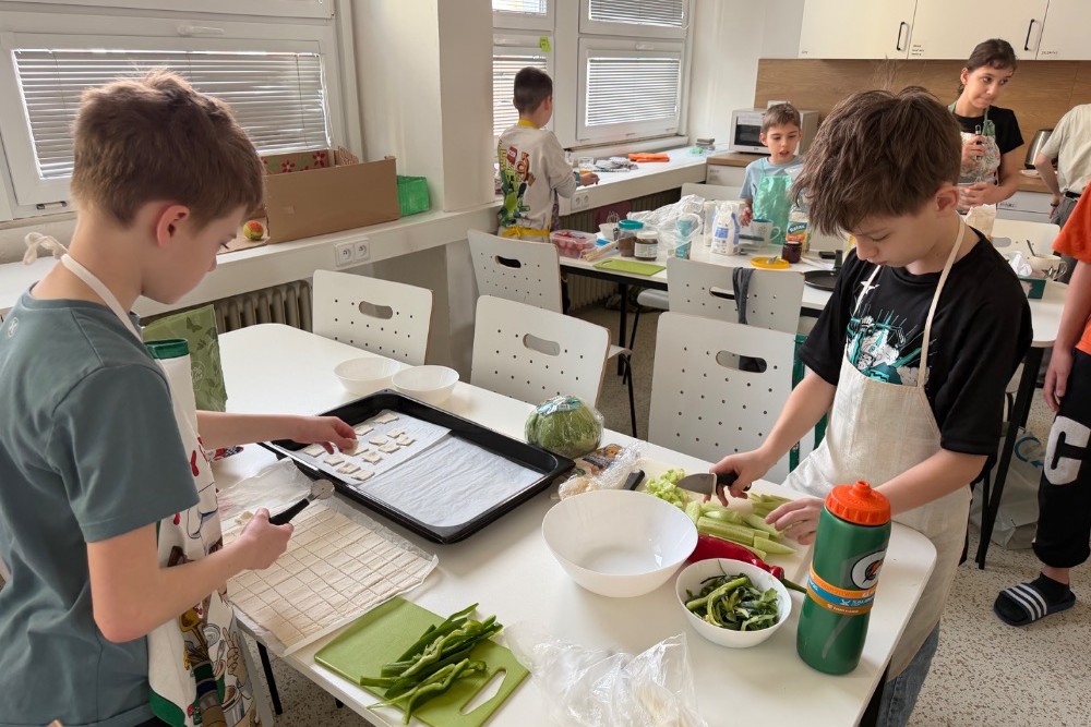Středu 25. 3. 2026 strávila třída 5.B velkou část vyučování ve školní kuchyňce, kde si děti vyzkoušely roli malých velkých kuchařů. Ve skupinkách děti pekly z listového těsta slané pizza šneky i sladké šneky plněné nutellou. Kuchyňkou se také linula vůně tradičních palačinek zdobených jahodami se šlehačkou, ale i jejich zdravější varianta – fitness palačinek z ovesných vloček a banánu. Nechyběl ani svěží šopský salát doplněný krutony z listového těsta sypanými parmazánem. Mezi nejjednodušší, ale velmi chutné recepty patřily listové tyčinky sypané kmínem. Během tohoto netradičně stráveného dopoledne si děti v praxi vyzkoušely odměřování a vážení surovin, učily se odhadům, procvičily svou manuální zručnost a především spolupráci a kooperaci ve skupině. Po ochutnávce skvěle připravených pokrmů a společném úklidu kuchyně na děti čekala druhá část programu. Své nabyté praktické zkušenosti využily při vytváření receptů na pokrmy, které samy připravily. I při této činnosti se děti učily vzájemné součinnosti a toleranci. Děti si den velmi užily a odnesly si nejen nové dovednosti, ale i spoustu chutných zážitků.