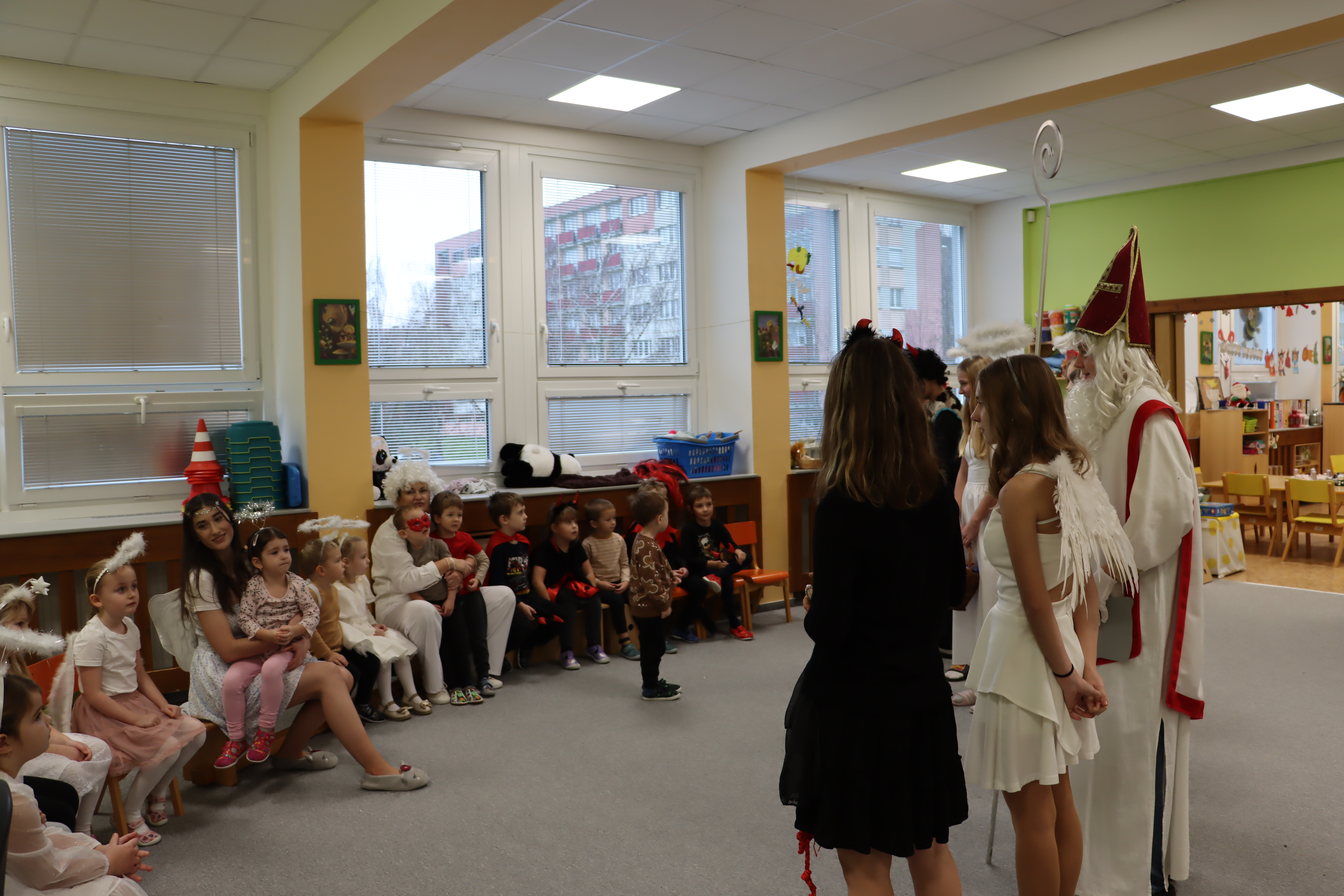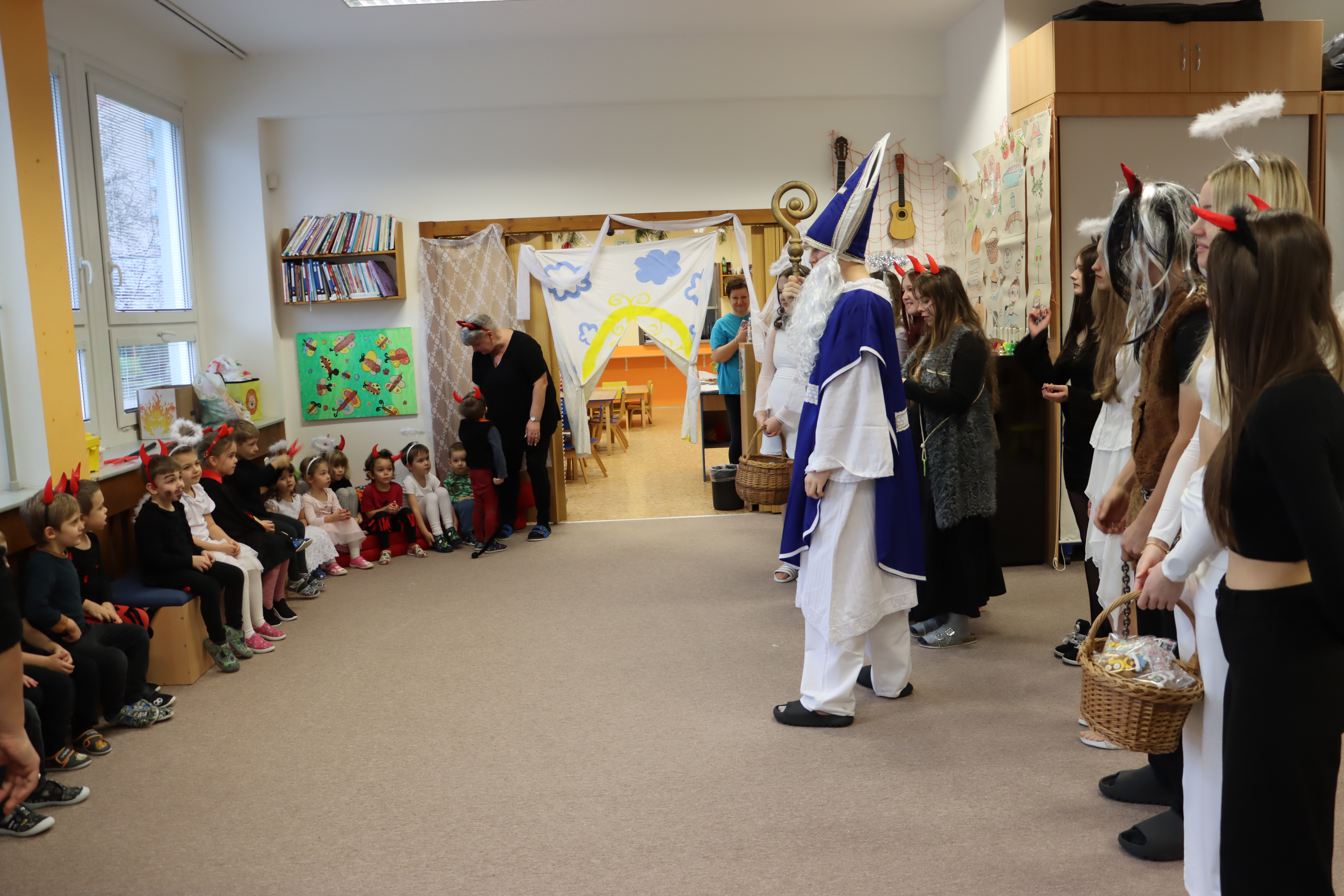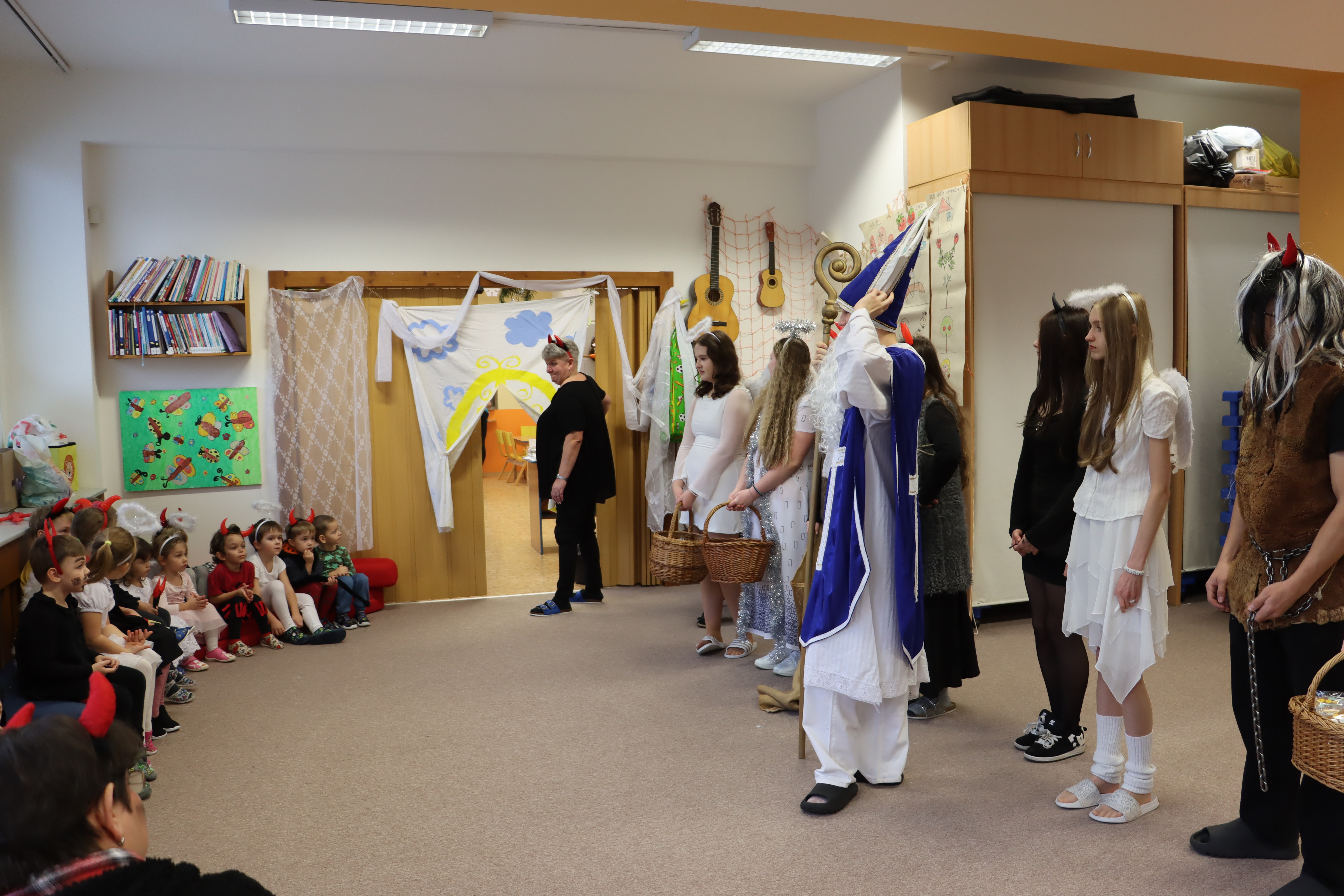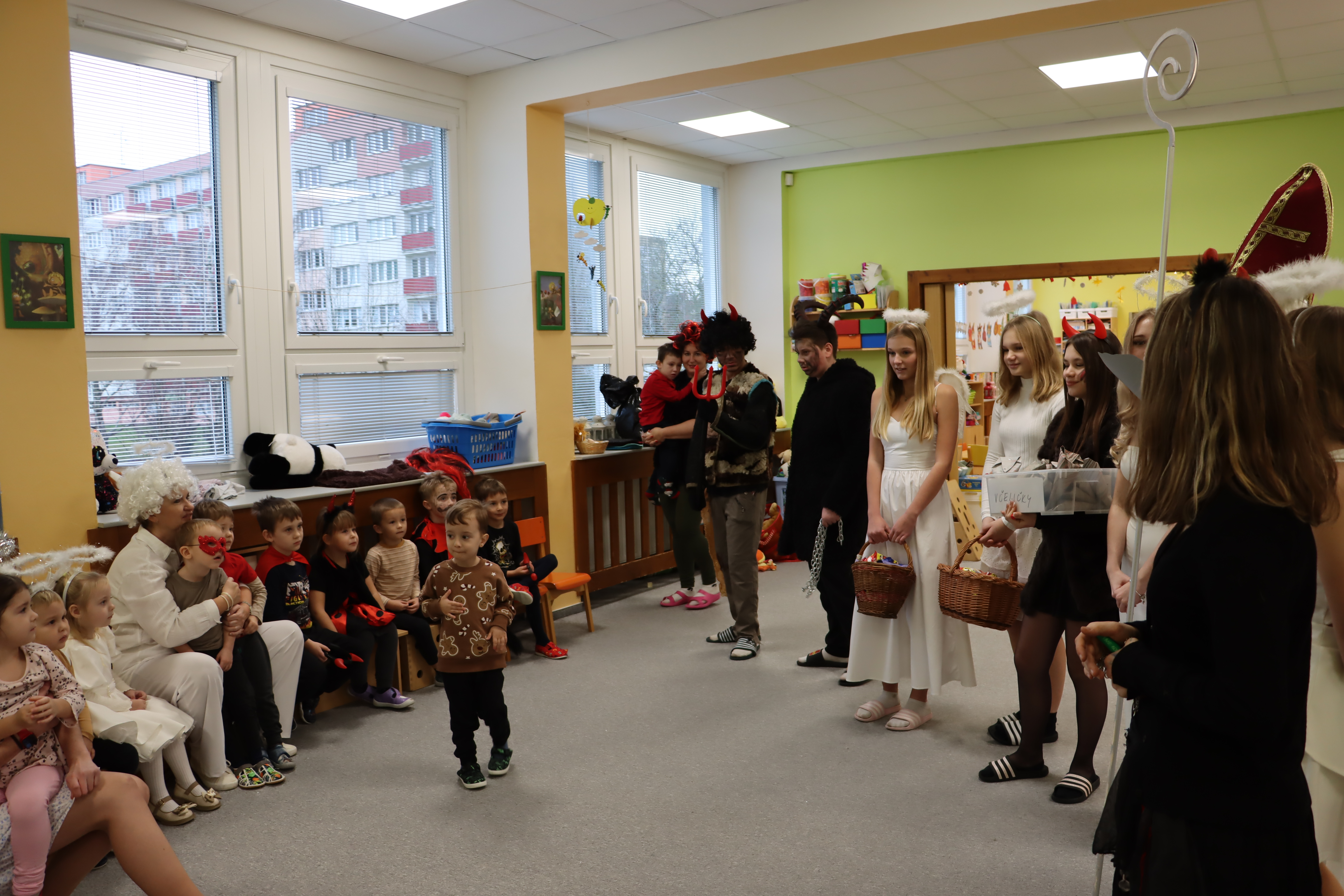 V pátek 5.12.2025 naši školku navštívila družina Mikuláše s anděly a čerty s nadílkou.