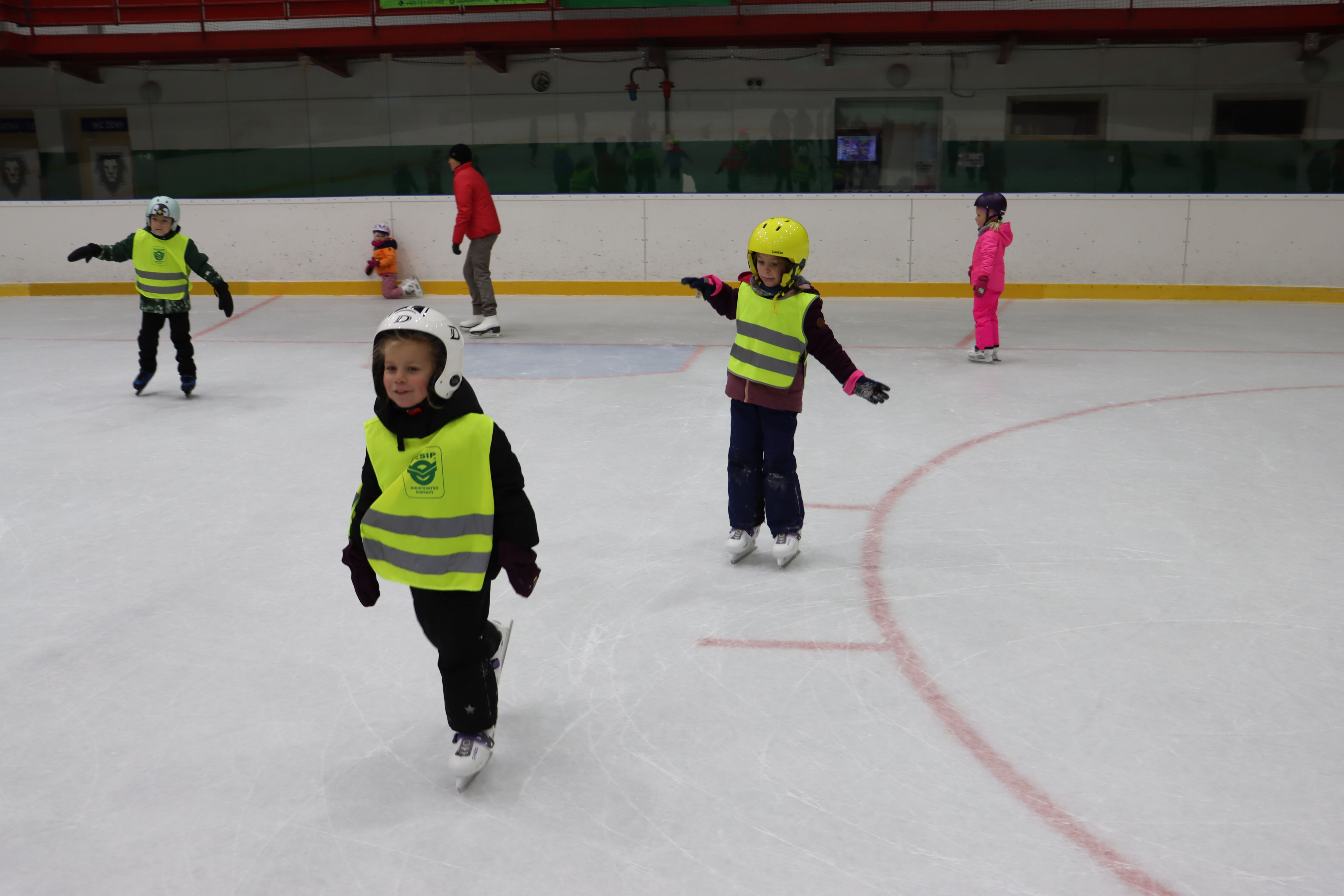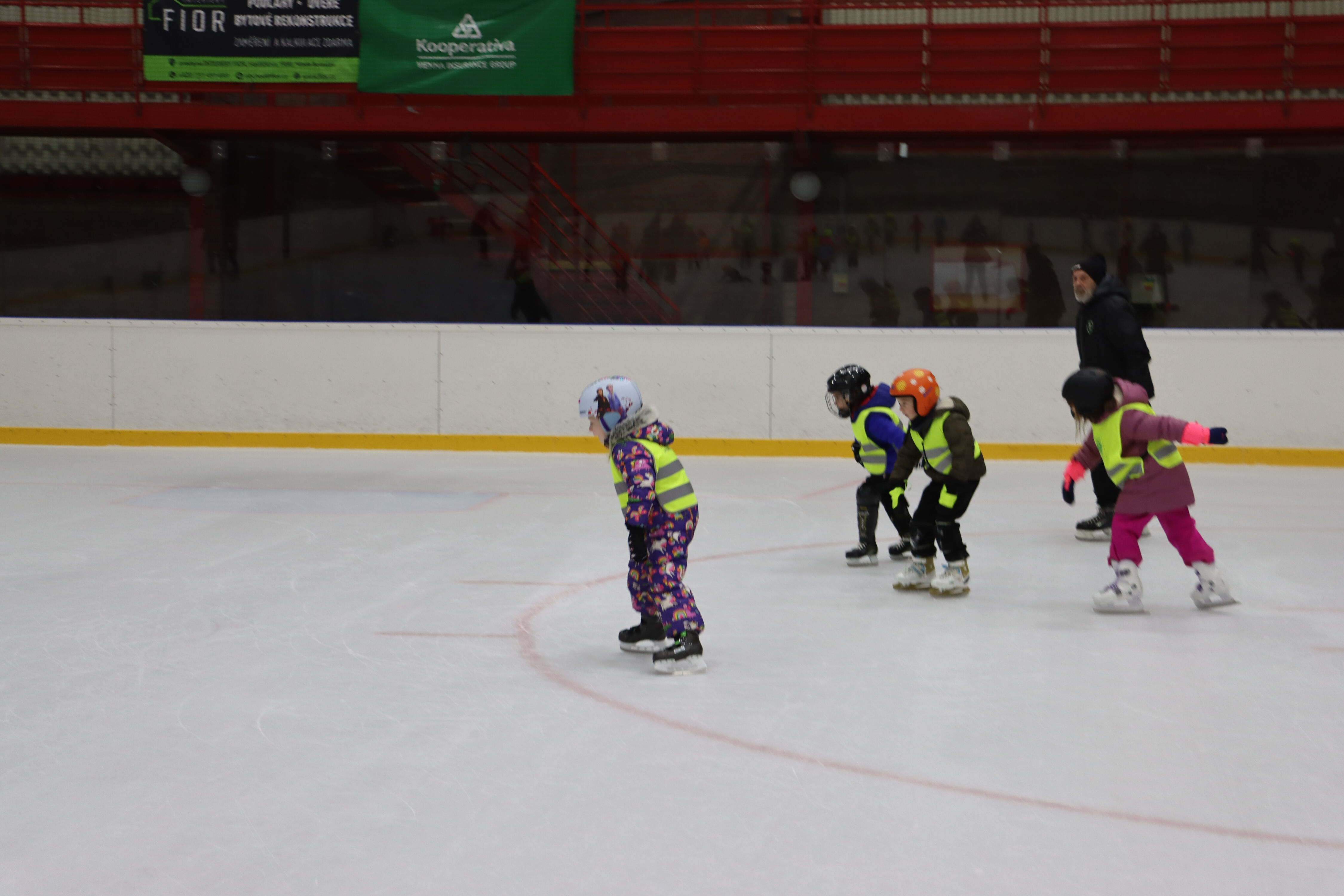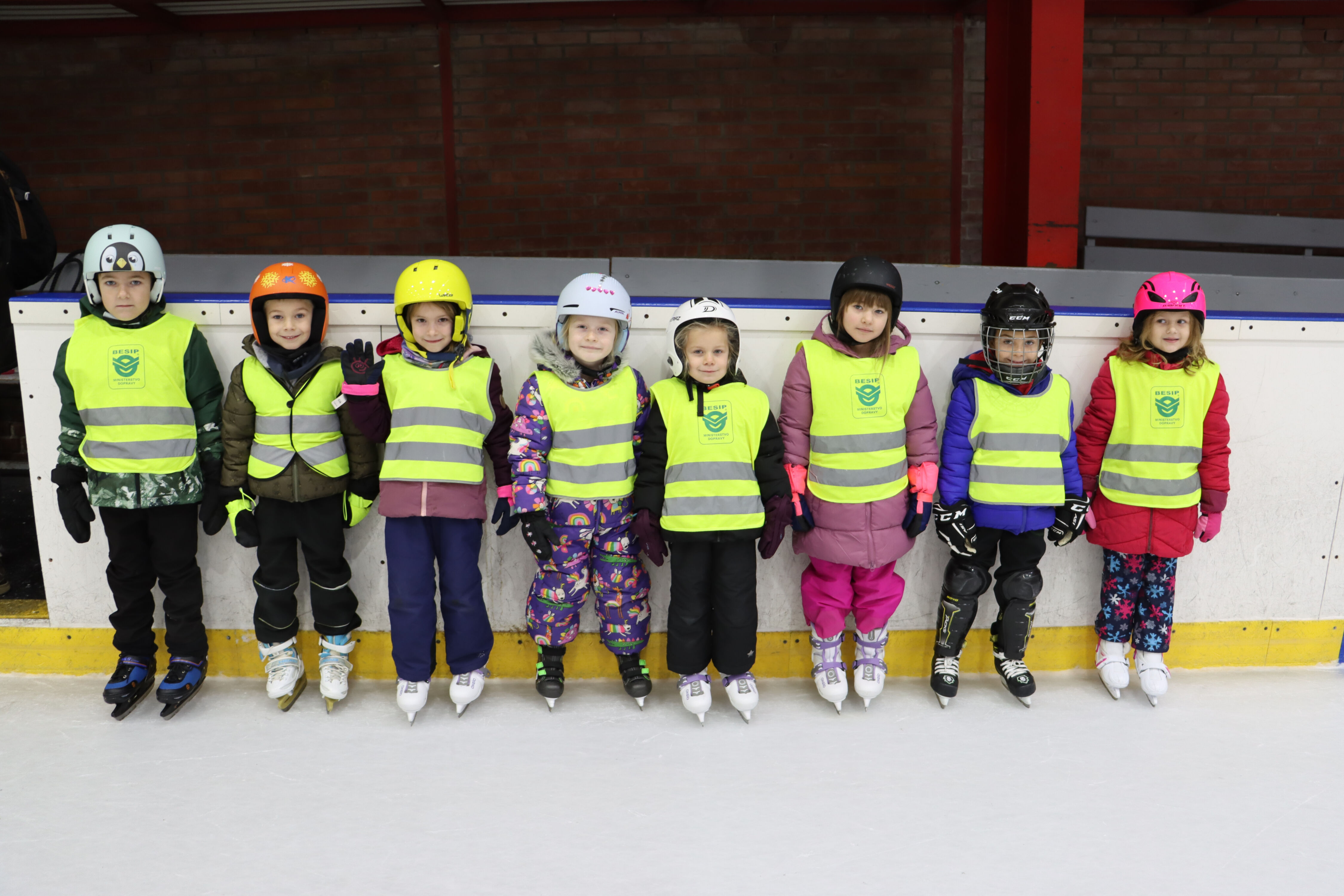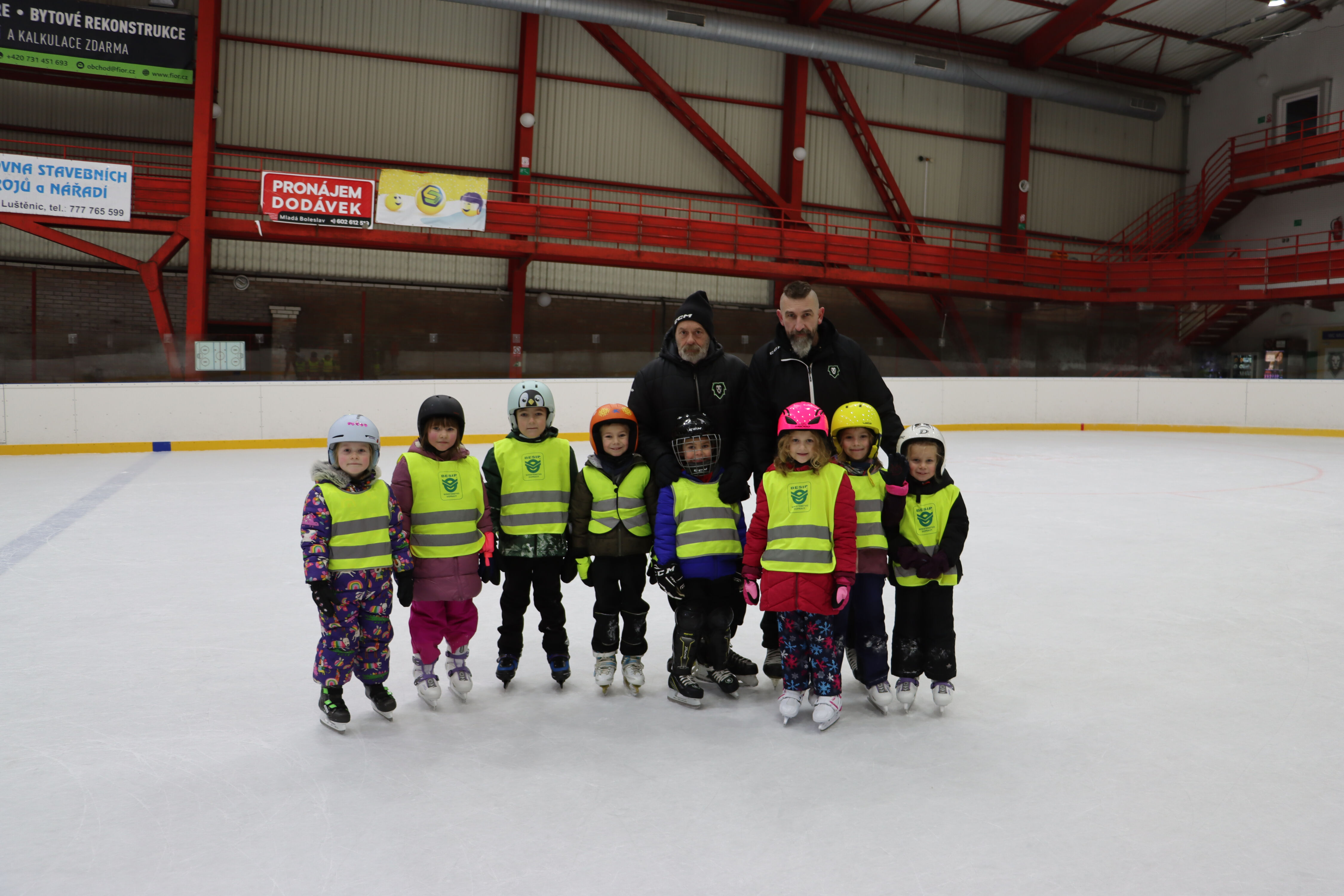 S předškoláky chodíme bruslit na zimní stadion pod vedením hokejových trenérů BK Mladá Boleslav.