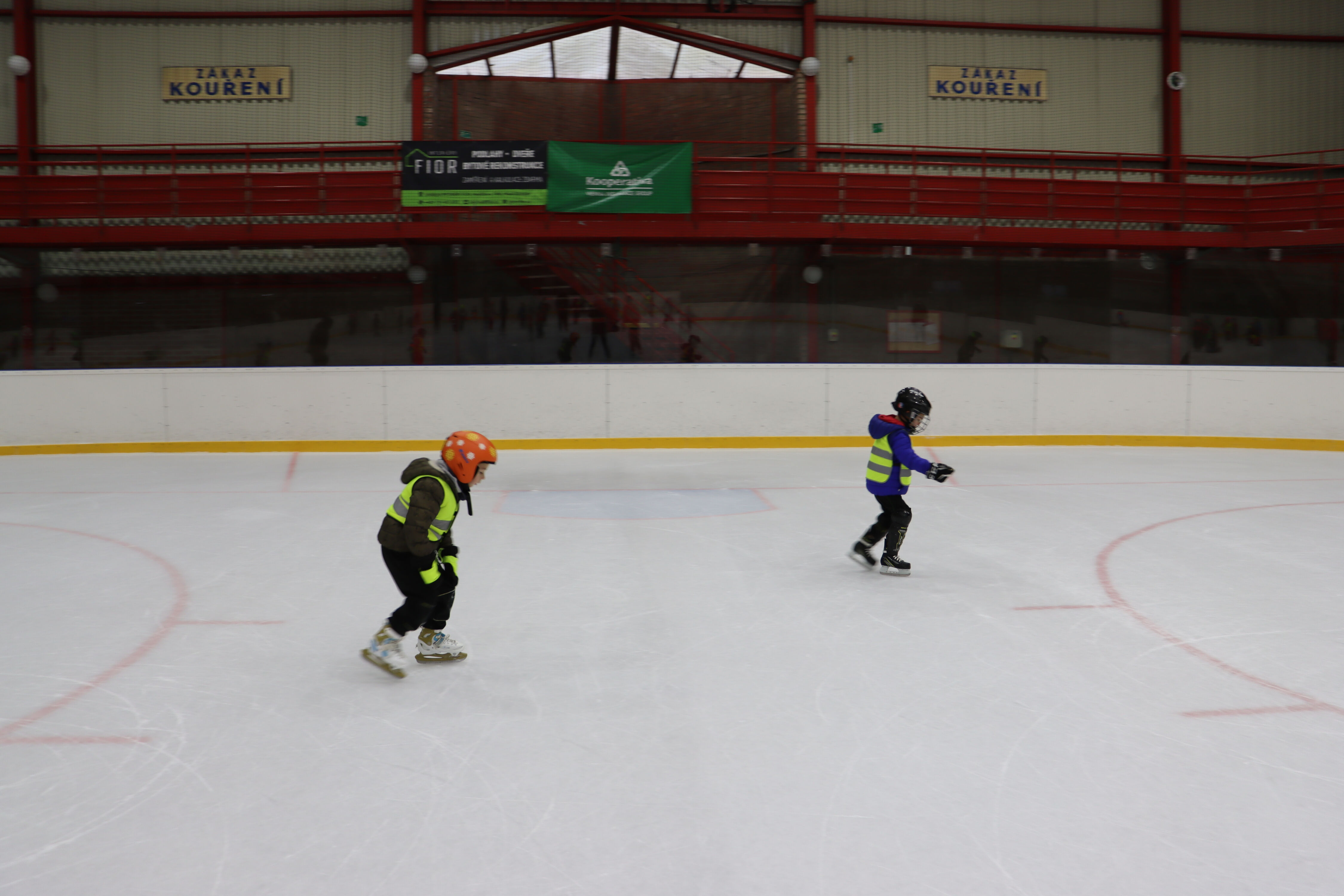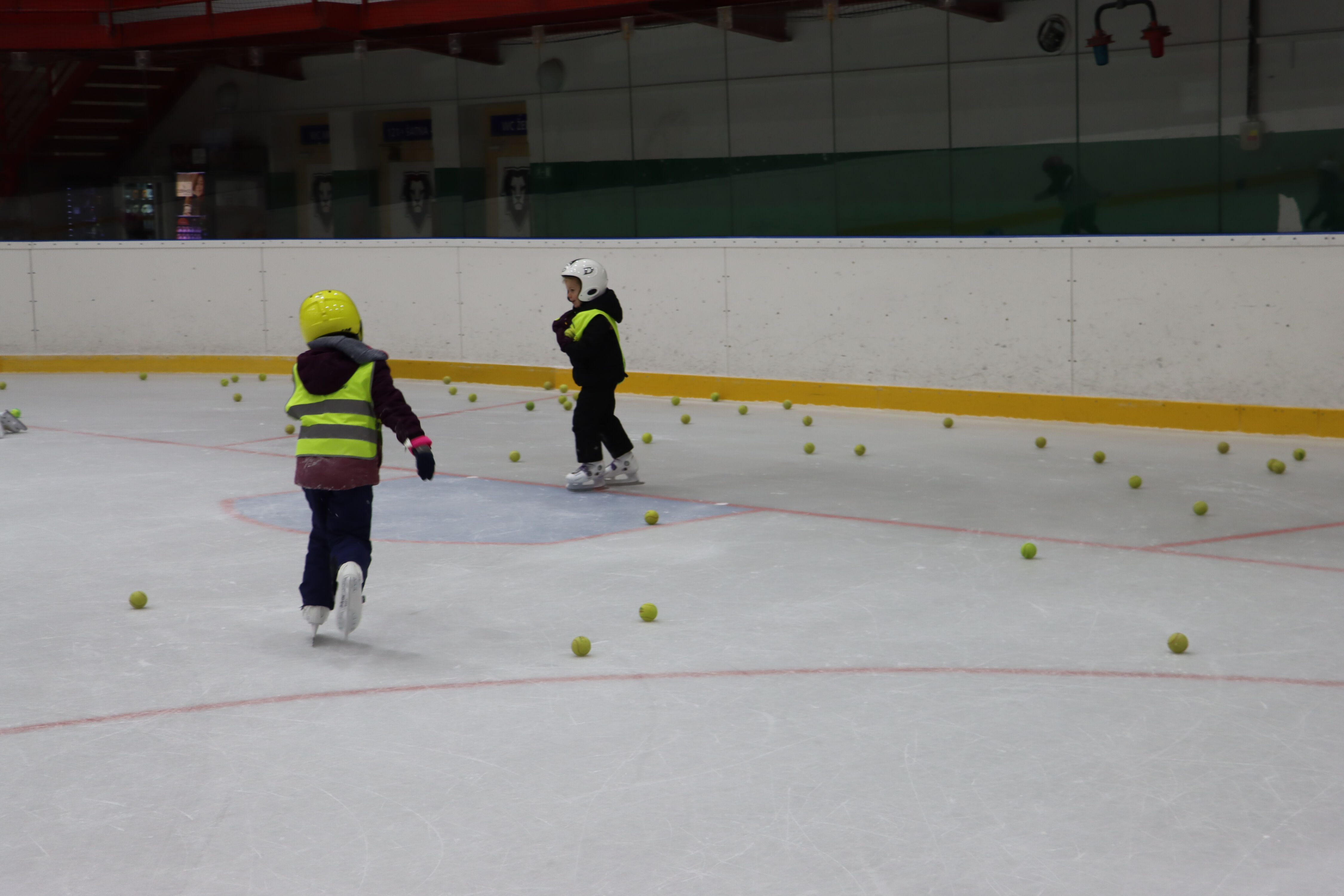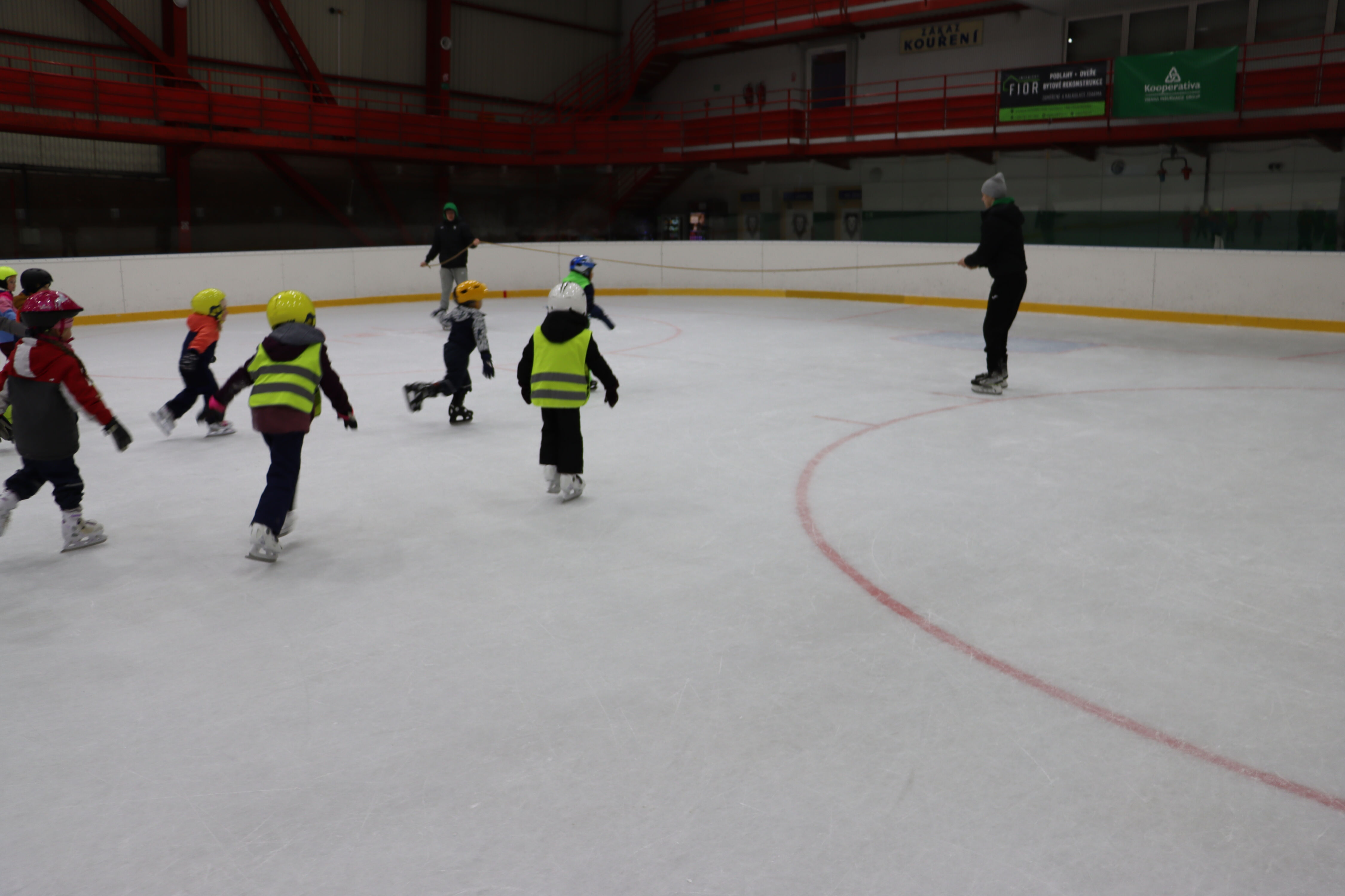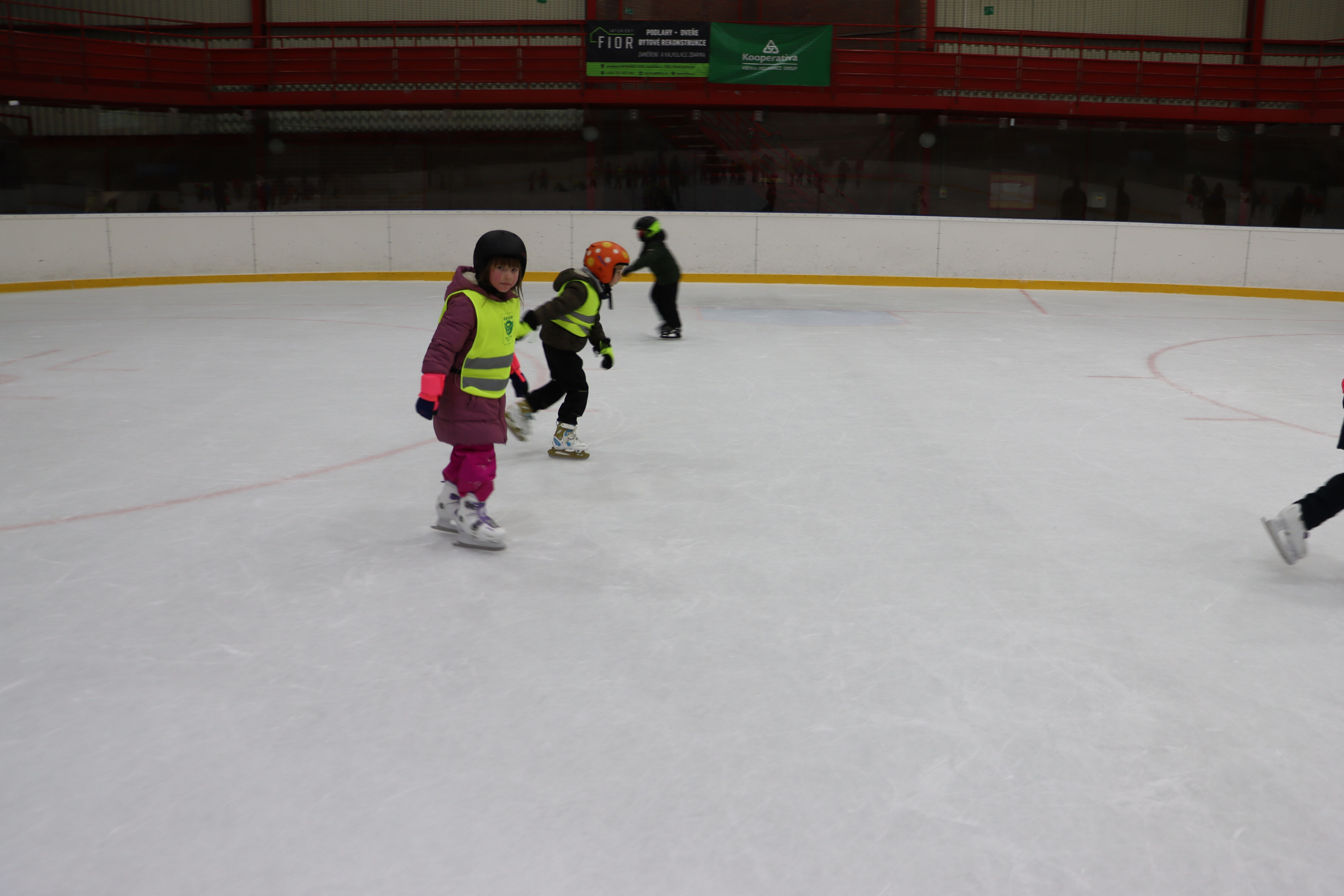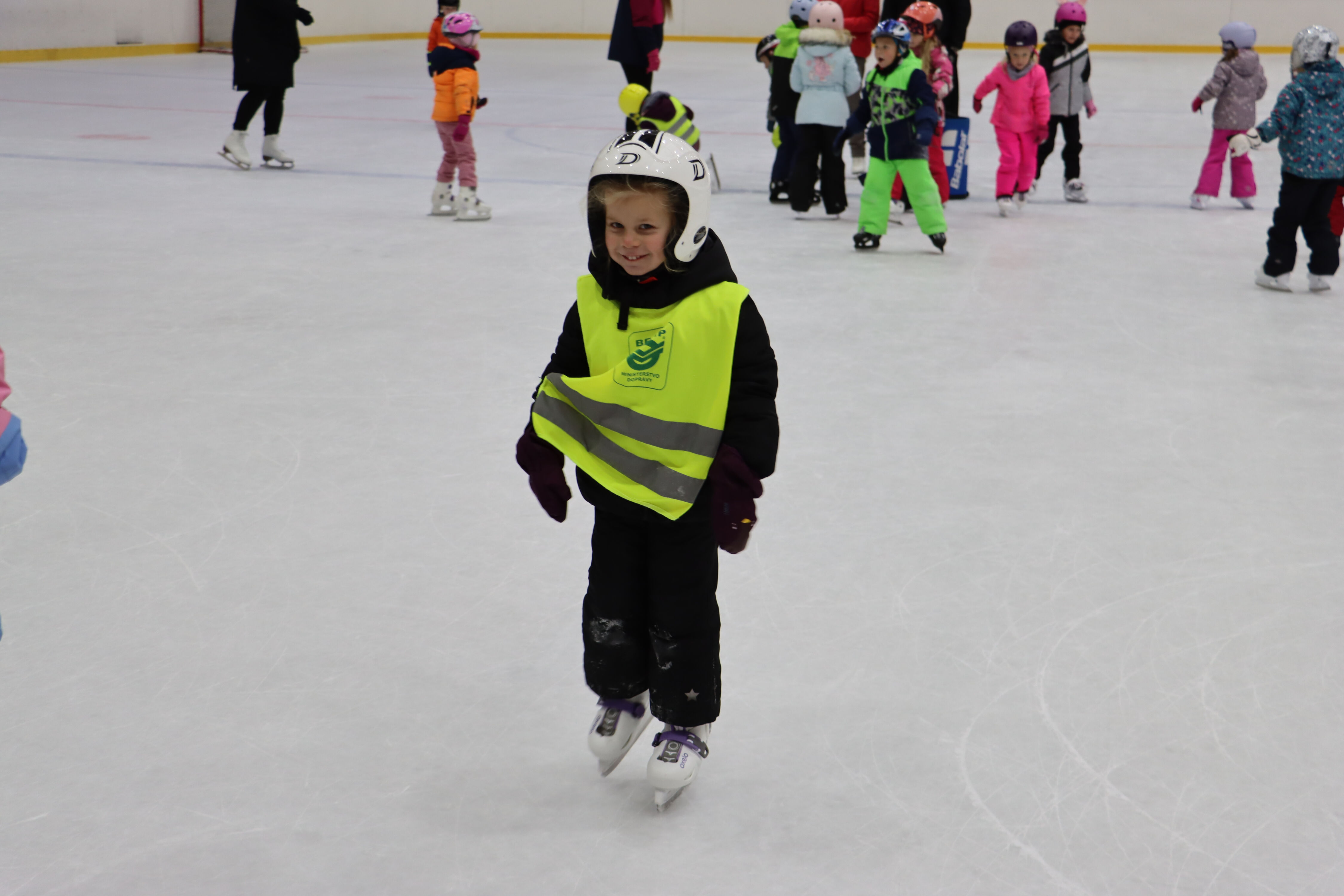 S předškoláky chodíme bruslit na zimní stadion pod vedením hokejových trenérů BK Mladá Boleslav.