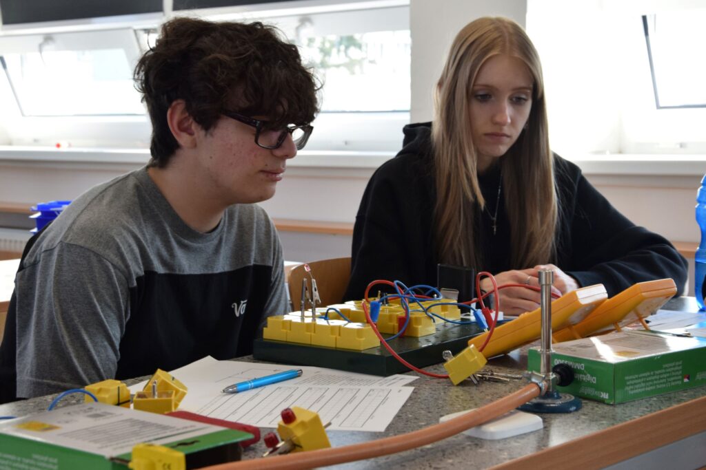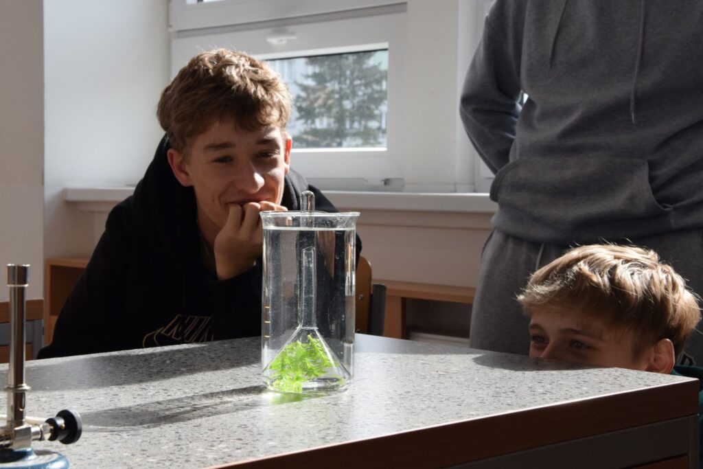 Žáci 9. ročníku se pustili do důkazu přijímání vody rostlinami a čekali, zda se zbarví květ sněženky zapíchnuté do obarvené vody, pozorovali průběh fotosyntézy na vodních rostlinách. Také se pustli do měření napětí a proudu na různě barevných LED diodách a následně sestavili jejich voltampérovou charakteristiku.