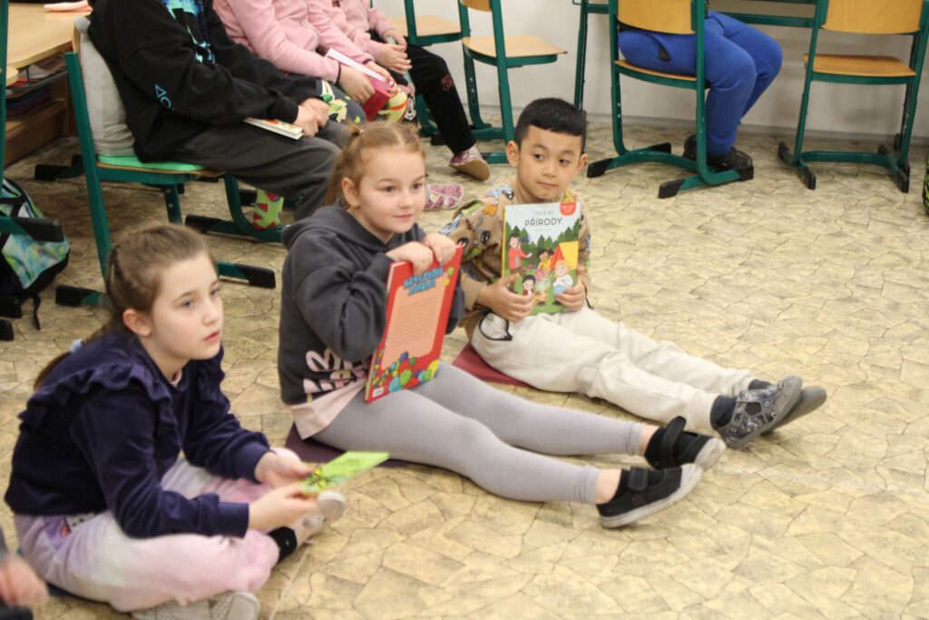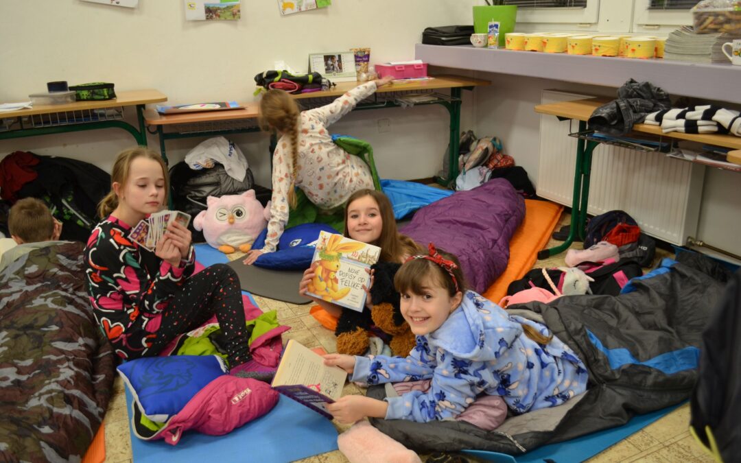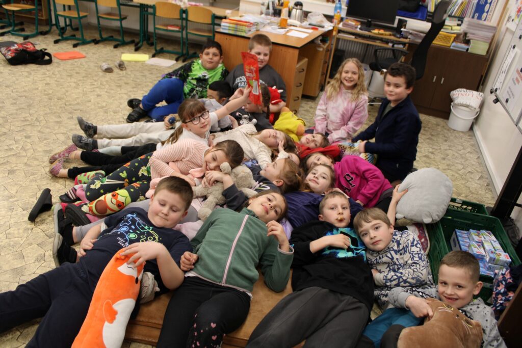 Druháci z 2.A si přinesli své oblíbené knížky, které během večera sdíleli se spolužáky. Ve skupinkách plnili zábavné úkoly, četli a povídali si o příbězích, které je zaujaly. Nechyběl ani tanec a společné hry, které vytvořily veselou a přátelskou atmosféru. Na závěr si děti rozložily spacáky a po dni plném zážitků spokojeně usnuly.