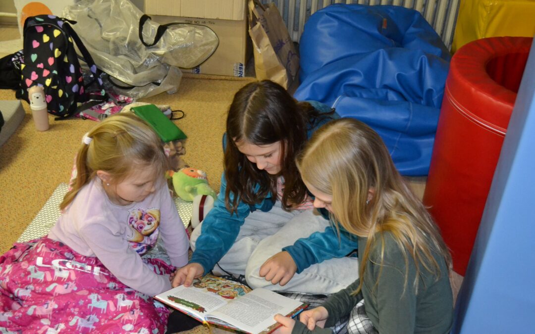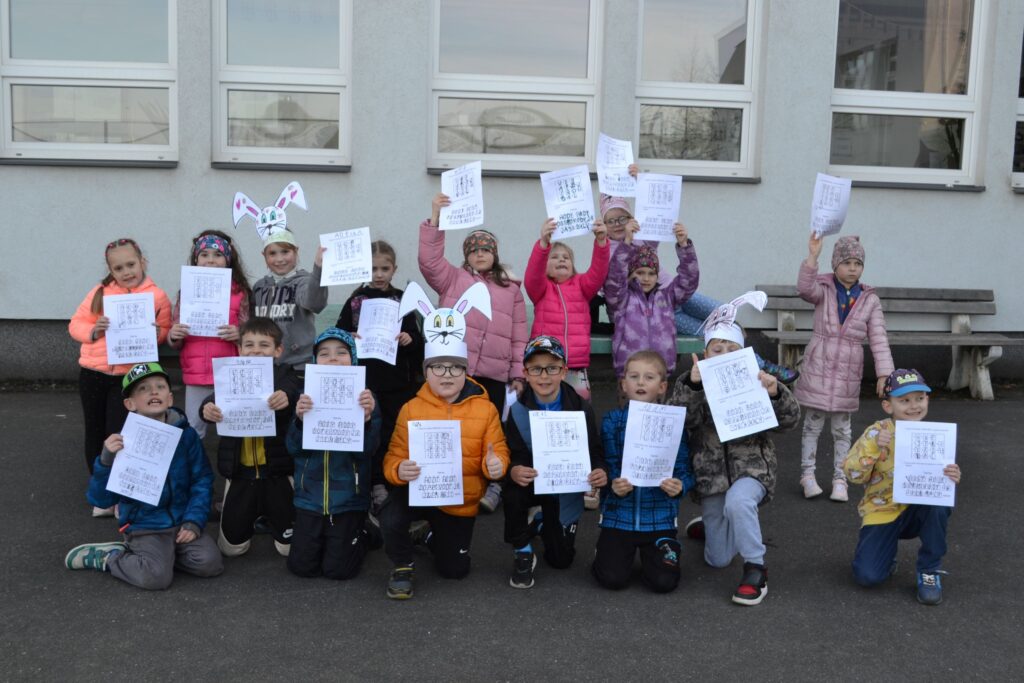 Děti z 1.B se ve středu 1.dubna 2026 netradičně sešly před školou ještě jednou v 17 hodin odpoledne, aby zažily i nocování ve škole. Nejprve si za pomoci rodičů připravily provizorní postýlky v aule naší školy a do školní kuchyňky putovalo mnoho dobrot připravených doma. Jejich prvním úkolem bylo na školním hřišti vyřešit velikonoční zajíčkovu tajenku. Společnými silami to zvládly a odměnou jim byl čokoládový zajíček. V kuchyňce si potom samy připravily k večeři zelenino – ovocný veselý talíř, jehož základem bylo vařené vajíčko. Po večeři si zahrály motivační a komunikační hry a pak už se chystaly do postýlek. Děti z 5.A, které také přespávaly ve škole, jim přišly přečíst pohádku a pak jim ještě připravily aprílovou stezku odvahy. MOC DĚKUJEME PÁŤÁKŮM!